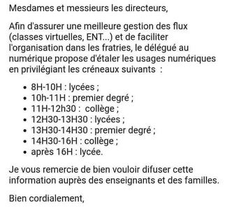 Nous avons été alertés de la large diffusion d’un message relayé sur les réseaux sociaux, et qui indique une organisation des différents niveaux d’enseignement sur la journée. La mention du message veut que cette consigne provienne de la Délégation Académique au Numérique.