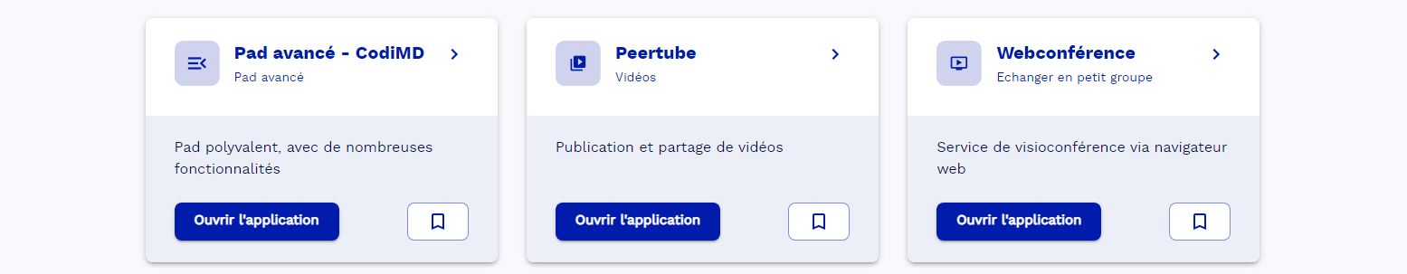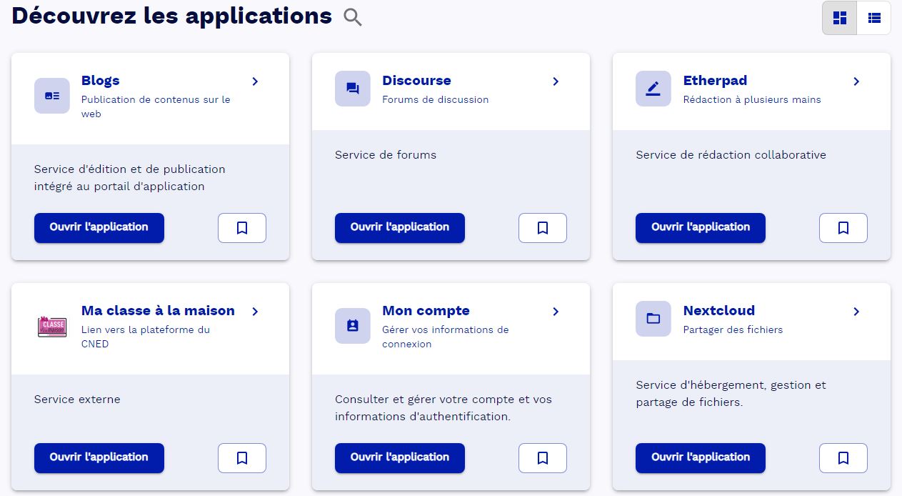 Une fois l’inscription effectuée et confirmée, vous parvenez sur la plateforme avec les applications proposées :