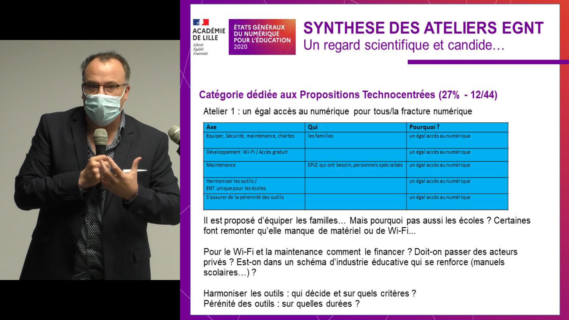 Monsieur Luc Waymel de l’association des maires ruraux du Nord a insisté sur le fait que l’enjeu n’est pas tant l’équipement que les possibilités en connexion, dans les territoires les plus reculés de l’académie. Il a présenté les actions sociales menées en faveur des usages du numériques : partenariat avec Orange pour les abonnements, reconditionnement de matériels, modalités d’accès gratuites au Wifi…