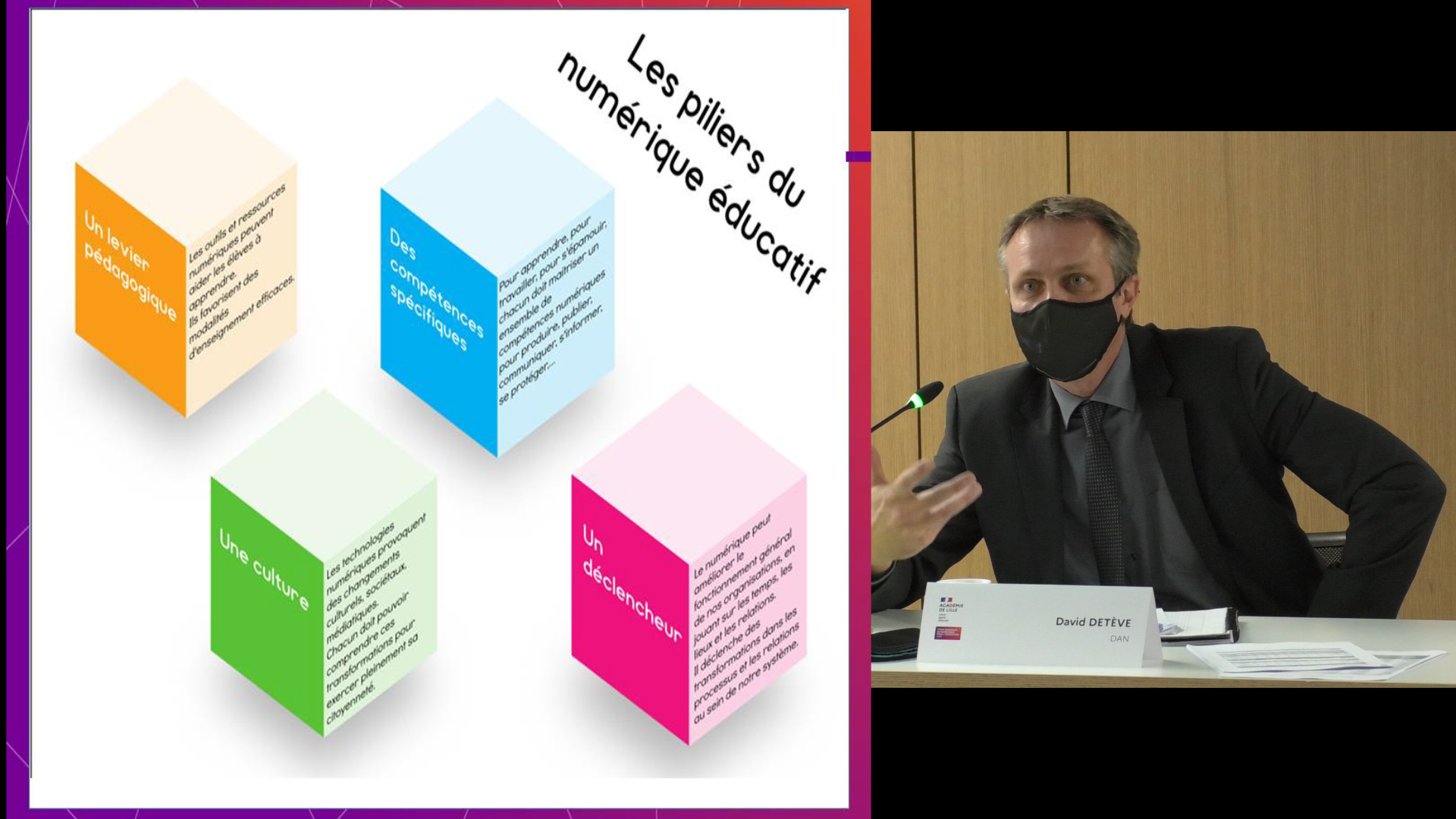 Monsieur Mohammed Bennani, Directeur des Systèmes d’Information, et Monsieur David Detève, Délégué Académique au Numérique de l’Académie de Lille ont débuté la séance de travail par une définition du numérique, qui précise que le concept englobe l’informatique, la téléphonie et plus largement la communication et l’Internet. Le numérique est un moyen d’agir sur la gestion de la vie quotidienne, de la scolarité de l’élève et de la carrière des professionnels. Monsieur Detève a ajouté que le numérique éducatif repose sur 4 piliers : c’est un levier pour mieux apprendre, un ensemble de compétences spécifiques, une culture et un déclencheur permettant d’améliorer le fonctionnement global des organisations (comme nous l’avons vécu à l’occasion du confinement). Monsieur Bennani s’est référé à des travaux universitaires pour conclure en disant que le numérique est un amplificateur pédagogique.