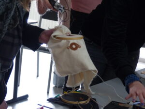 Autour d’un atelier haut-parleur en broderie, le public a pu discuter des possibilités et limites entre art, artisanat et technologie. On a vu qu’il était envisageable d’ajuster les systèmes électroniques à son activité, d’y introduire une utilisation tactile du son de manière interactive.