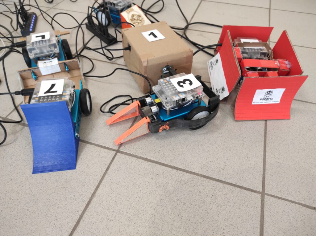 Chaque équipe dispose de cinq minutes pour présenter son projet à l’aide d’un diaporama. L’objectif est d’expliquer comment le robot a été programmé et modifié en vue de l’épreuve finale : une bataille de robots de type sumo. Les robots utilisés sont des mBot, auxquels les élèves ajoutent des pièces qu’ils ont conçues grâce à des logiciels 3D et imprimées ensuite pour améliorer leur efficacité lors des affrontements. Certains adoptent une attitude plus éco-responsable, en choisissant du carton recyclé. J’ignore à ce jour si ces jeunes créateurs ont réussi à bouter hors du cercle certains robots qui semblaient sortir du film Mad Max.